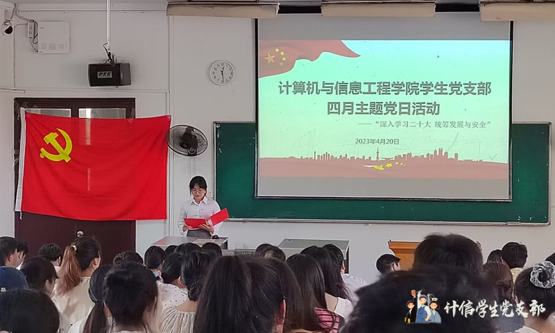 (通讯员何飞飞2023-4-20)为深入学习贯彻党的二十大精神、两会精神及习近平新时代中国特色社会主义思想主题教育工作会议精神,计算机与信息工程学院学生党支部于2023年4月20日12时30分在教育大楼1J13教室开展了以“深入学习二十大,统筹发展与安全”为主题的党日活动。与会人员有计算机与信息工程学院学生第一党支部书记冯欣老师、第四党支部书记向阳老师以及学生党支部全体党员。