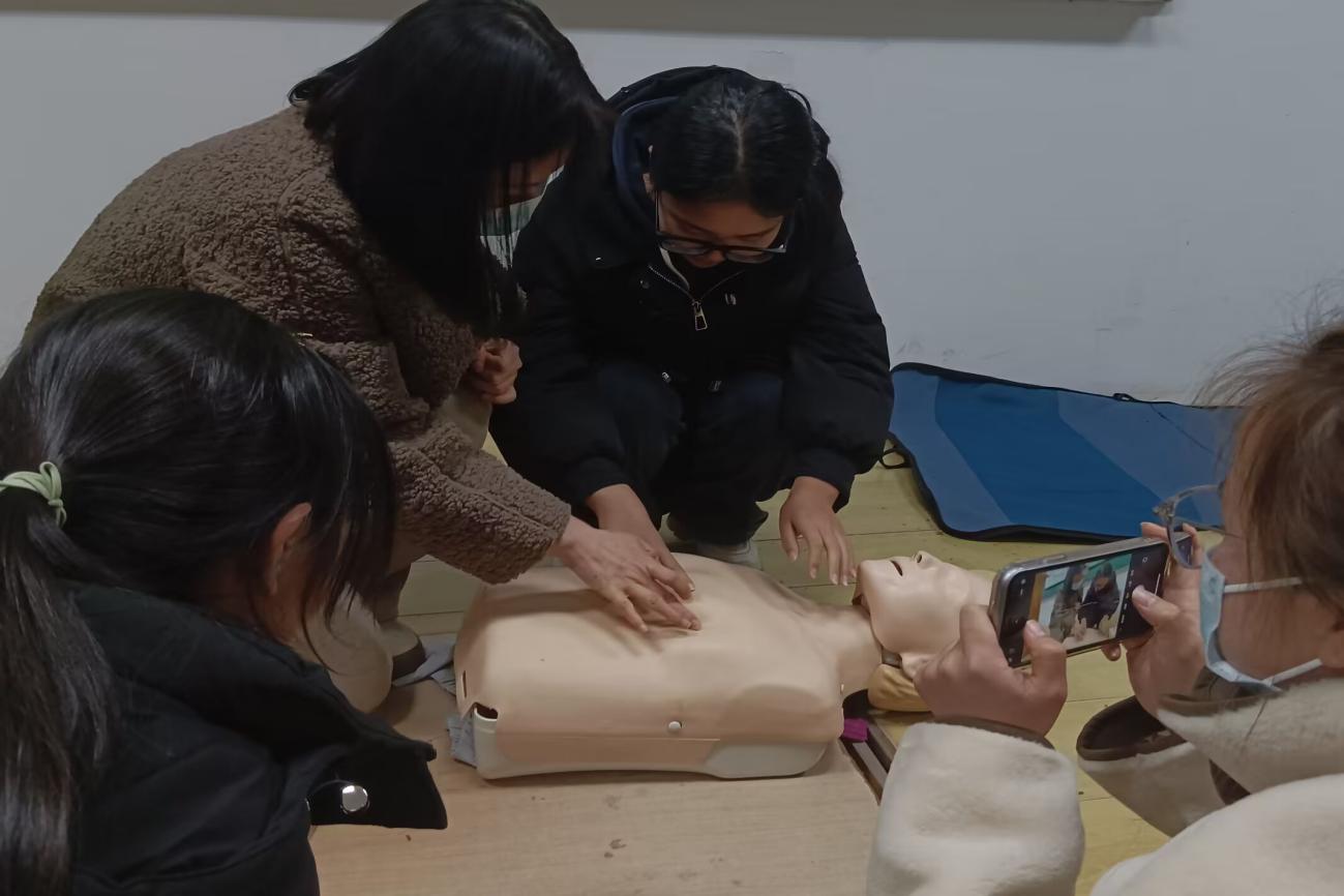 随后市中心医院急诊医学科院前急救团队的刘晚红、胡蝶两位老师向同学们普及了成人BLS救护知识和异物梗阻急救知识。两位老师现场展示了BLS操作及海姆立克急救手法。同学们积极参与现场互动,在医护人员指导下,使用BLS模拟人进行心肺复苏实操。