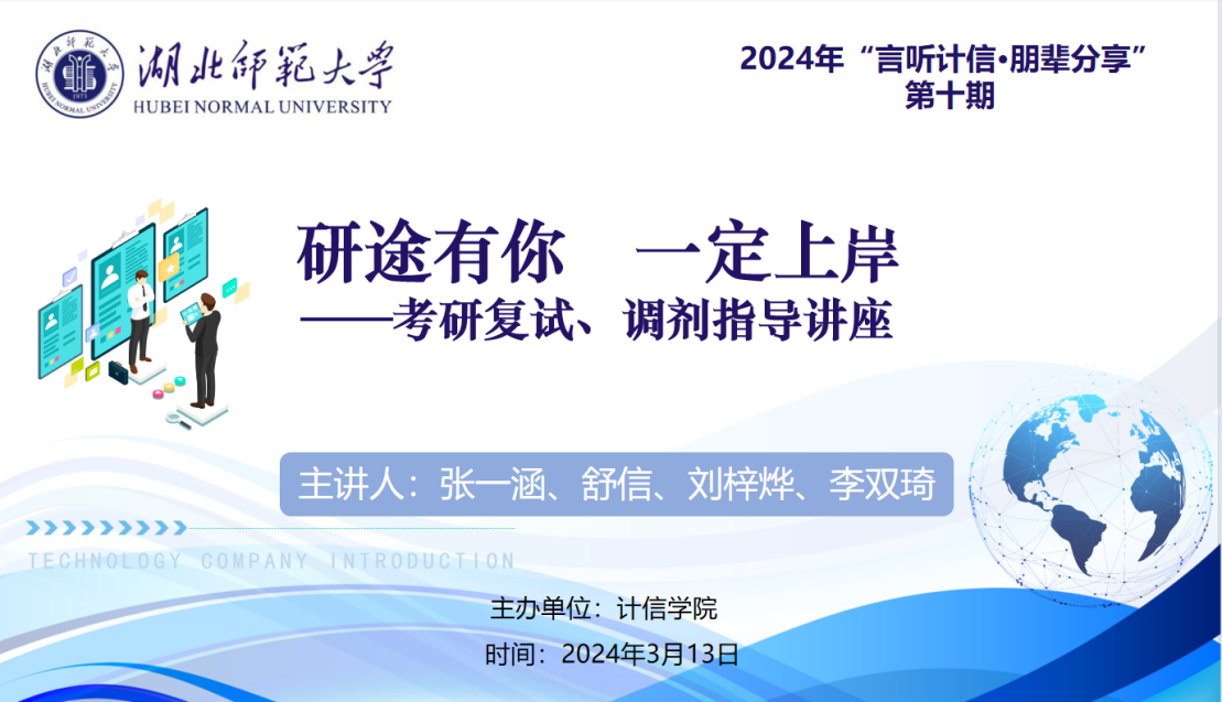3月13日晚,计算机与信息工程学院举办2024年“言听计信·朋辈分享”第十期主题为“研途有你 一定上岸”考研复试、调剂指导讲座。学院邀请了2023年录取为在读研究生张一涵、舒信、刘梓烨、李双琦,四位优秀毕业生分享了自己的考研复试、调剂相关经验,计算机与信息工程学院2020级部分考研学生线上聆听并提问。辅导员卢老师主持讲座。