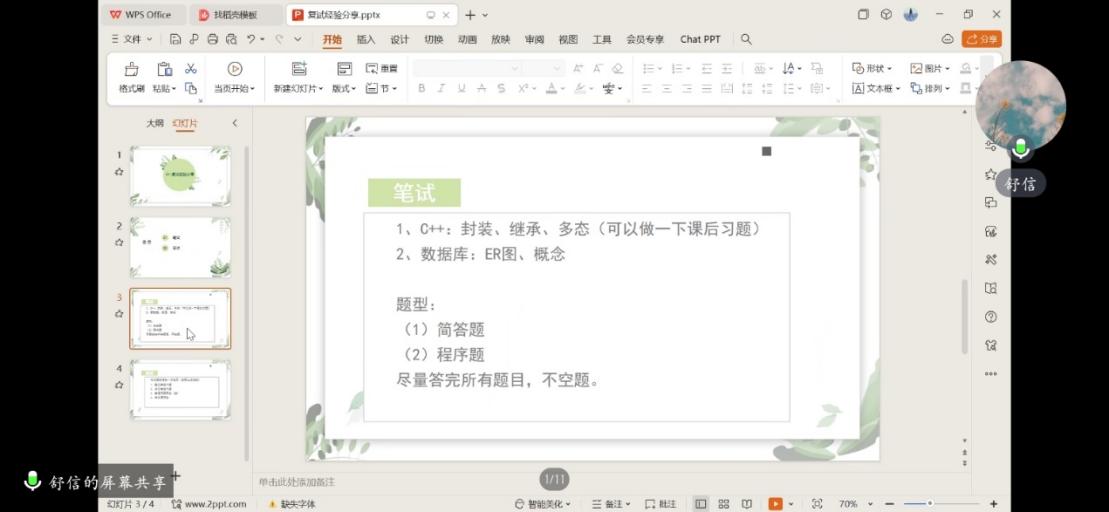 四位同学来自不同院校的不同专业,他们结合自身经历,从考前准备,简历准备,模拟复试,专业课笔试、面试流程,面试技巧,心态调整,临场发挥,细节完善等多个方面进行针对性、指导性分享,强调“不打无准备之战”的同时一定要自信诚实。张一涵从简历完善,回答面试中专业知识进行分享,并列举相关细节和技巧;舒信介绍了笔试题型,结合自己的经历提供相关专业课笔试范围,并建议“不要让面试冷场”;刘梓烨着重介绍笔试复习方法、技巧,强调准备要有规划,这样复试时才会心中有本;李舒琦提出要展现自身良好的综合素质,简历撰写突出个人优势,关注当前学术热点,做对话的主动者等方面。