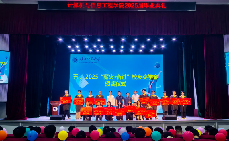 在备受瞩目的薪火·奋进校友奖学金颁奖环节,四位校友共同为考取湖南大学、华中师范大学等双一流高校研究生的优秀学子颁发校友奖学金。获奖学生代表周龙在发言中表达了对学院培养和校友关爱的感激之情,承诺将在未来的学术道路上继续发扬湖师精神。