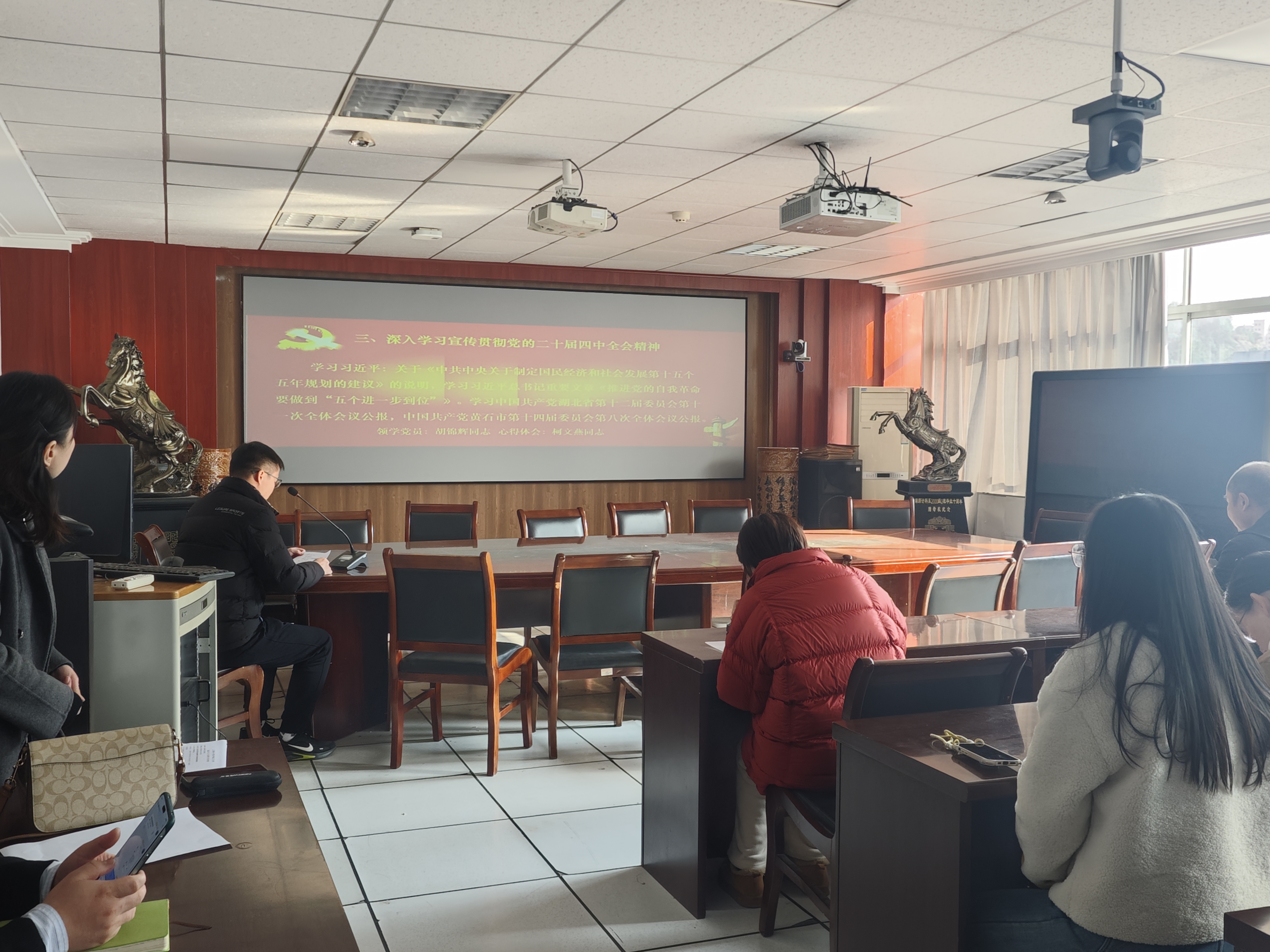 全体党员交纳党费,邓明华同志带领全体党员重温入党誓词。胡锦辉同志领学了习近平总书记关于《中共中央关于制定国民经济和社会发展第十五个五年规划的建议》的说明,以及习近平总书记重要文章《推进党的自我革命要做到“五个进一步到位”》。柯文燕同志做了题为“学深悟透全会精神 践行教育报国使命——学习贯彻省委十二届十一次全会精神心得体会”和“立足教育本职 服务区域发展——学习黄石市委十四届八次全会精神心得体会”的汇报。