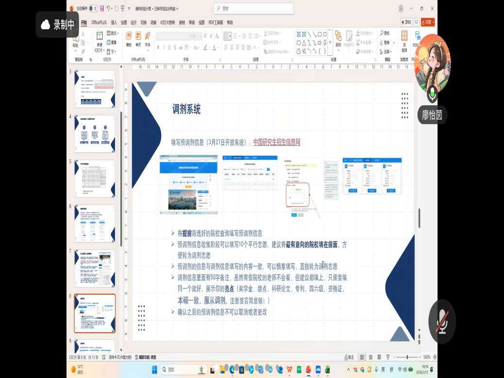 活动伊始,廖怡茵同学结合自身调剂上岸的亲身经历,带来实操性满满的经验分享。她介绍了自己从伟德victor1946教育技术学专业,一志愿报考天津师范大学,最终调剂至河北大学现代教育技术专业的全程经历,详细拆解研招网预调剂与正式调剂系统的操作要点、院校选择的实用方法,还分别讲解了线上、线下调剂复试的材料准备、行程规划与礼仪细节,为同学们提供了具体的调剂行动指南。